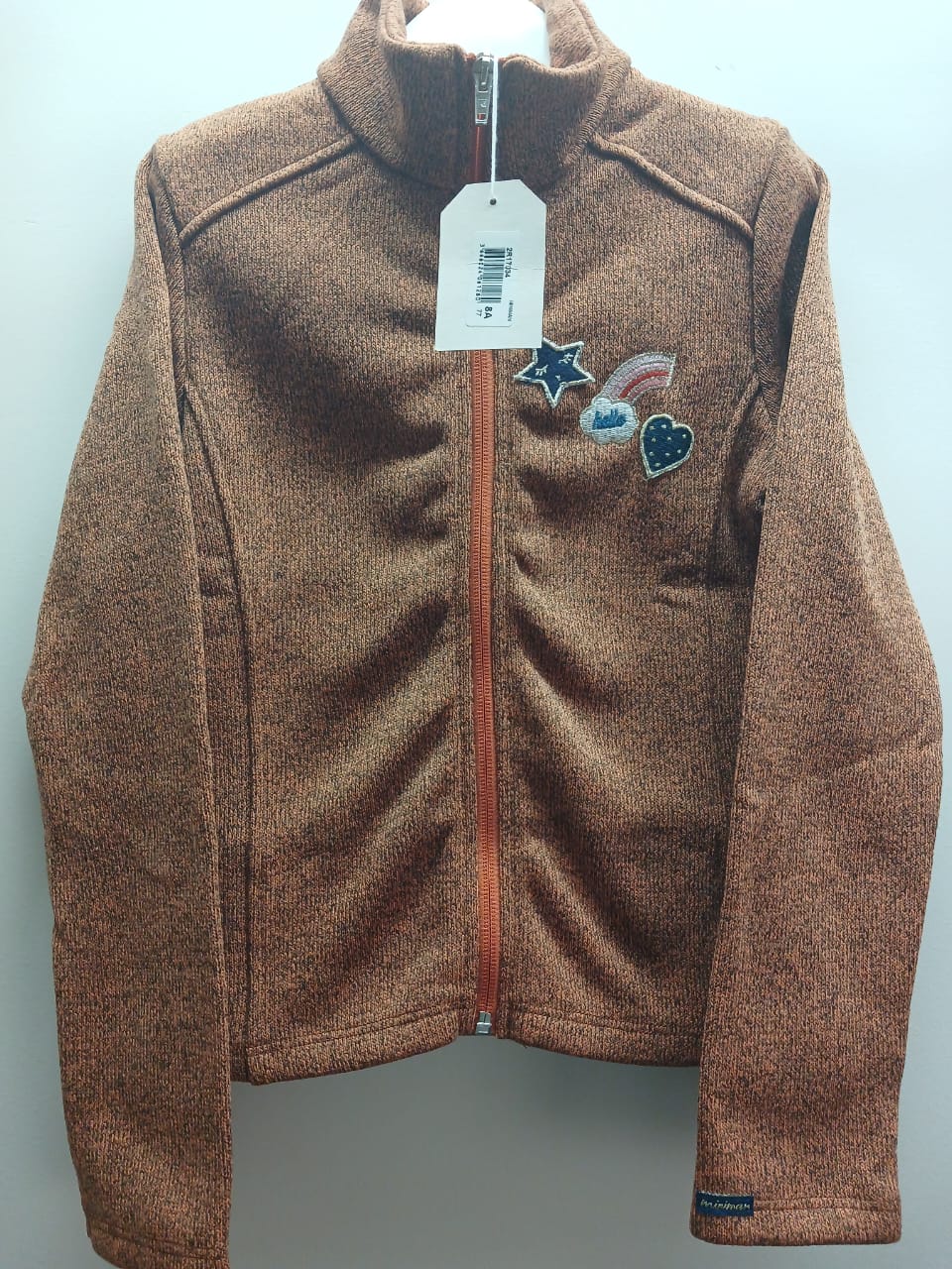 Blouson Miniman filles; couleur orange chiné, avec dessins sur le devant. Fermeture zippée. Léger et agréable à porter. Facile à assortir avec jupes, jean ou pantalon.