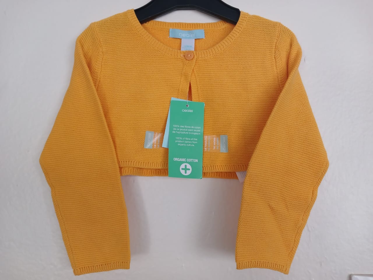 Petit boléro en maille douce jaune poussin- boutonné devant- agréable et chaud- Coton bio- 12 mois