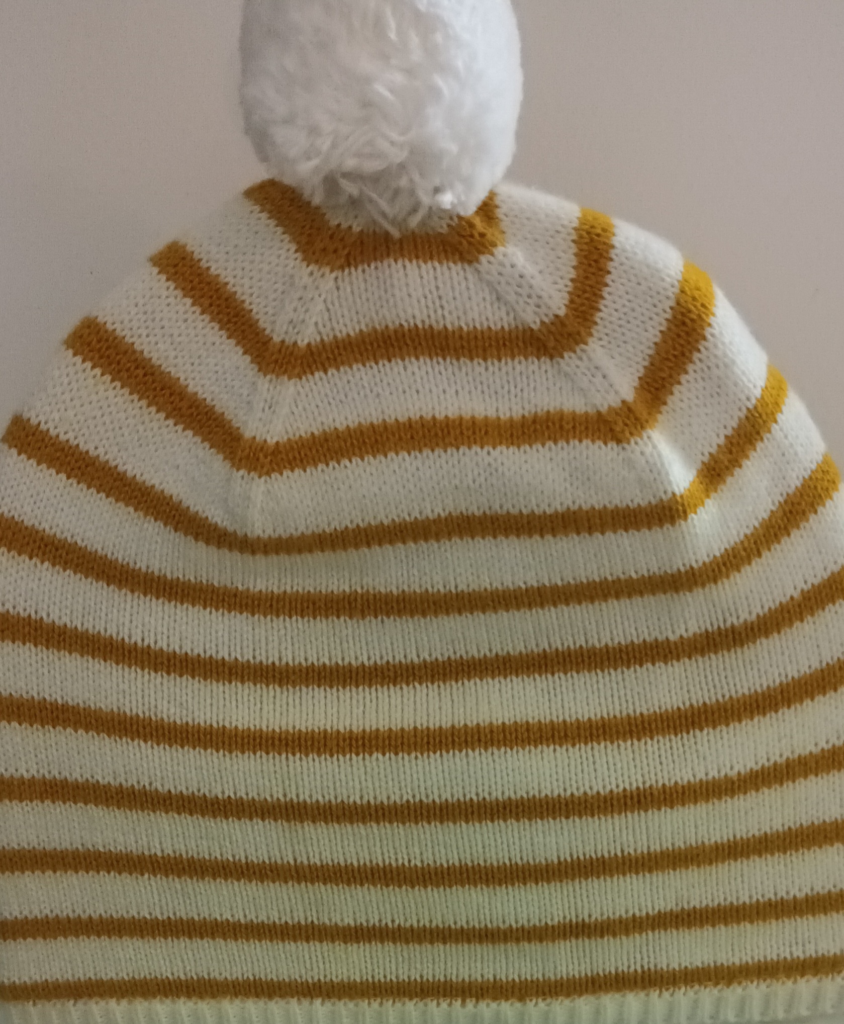 Bonnet chaud, élégant et doux, idéal pour l’hiver. Motif rayé moutarde et crème- joli pompon sur le dessus. Intérieur doublé pour plus de confort et de chaleur. Protège bien contre le froid.