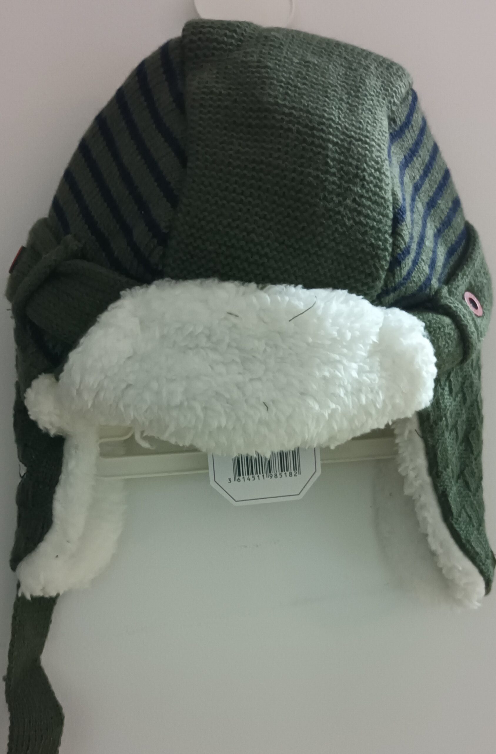 Bonnet chaud et pratique, idéal pour l’hiver. Extérieur Kaki sobre, doublure douce blanche. Protège bien les oreilles contre le froid.