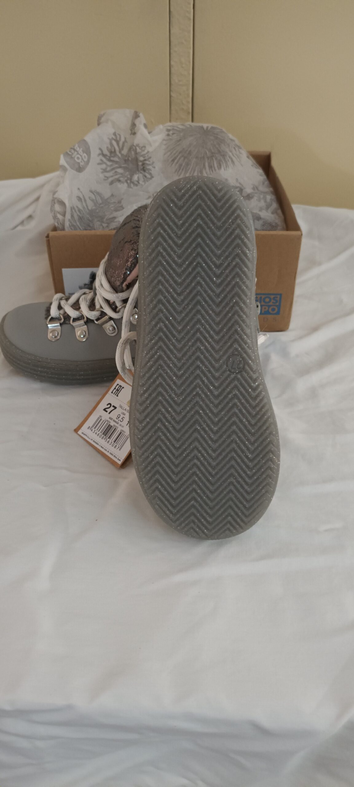 Chaussures montantes en cuir synthétique signées GIOS EPPO kids. Coloris gris argenté; intérieur rose. Fermeture à lacets, scratch et zip pour un enfilage facile. semelle souple en caoutchouc , antidérapante et petit insigne sur coté. Un look sport chic, façon Pataugas, à la fois robuste et confortable. Pointure 27.