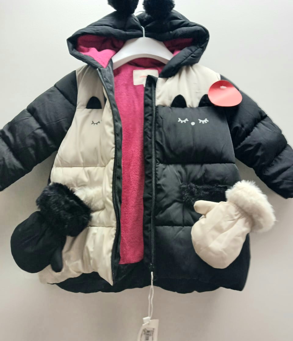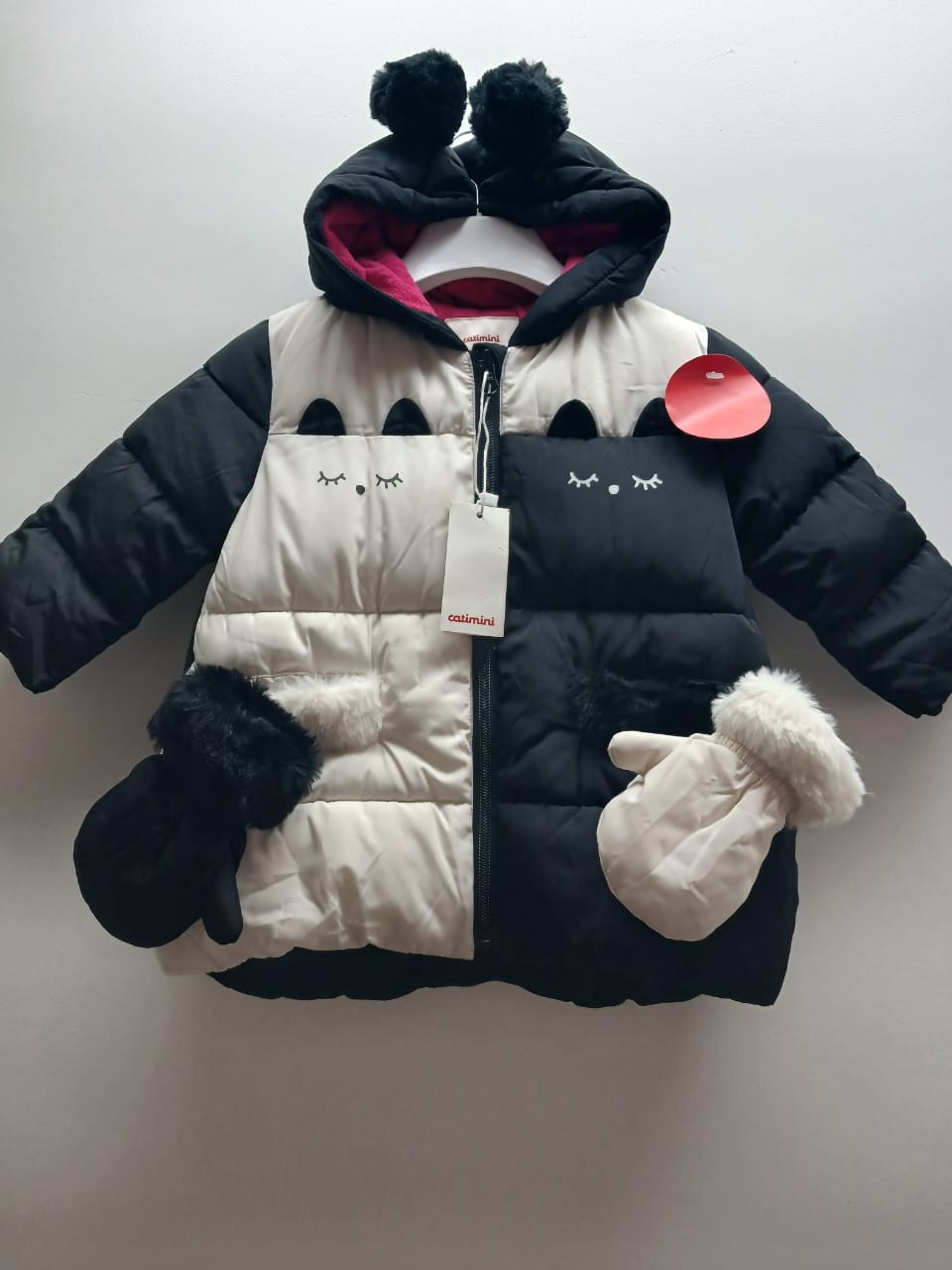 Superbe doudoune Catimini ( marque de qualité ) au style graphique et raffiné. L’extérieur noir et blanc contraste joliment avec l’intérieur fushia. Mitaines assorties noir et blanc. Chaude, confortable et légère, elle est idéale pour l’hiver au chaud. 12 mois