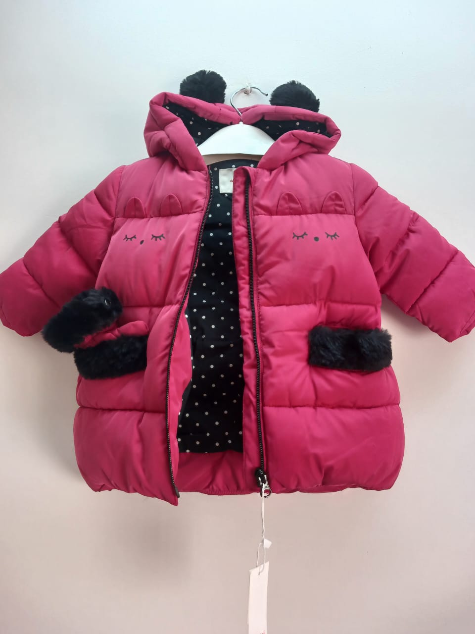 Douce et bien chaude, cette doudoune allie confort, et style. Sa couleur fushia contraste joliment avec la doublure marine à pois blancs, tout en coton. Des mitaines pour tenir les mains de bébés bien au chaud. Légère et confortable, elle constitue une belle création de Catimini.