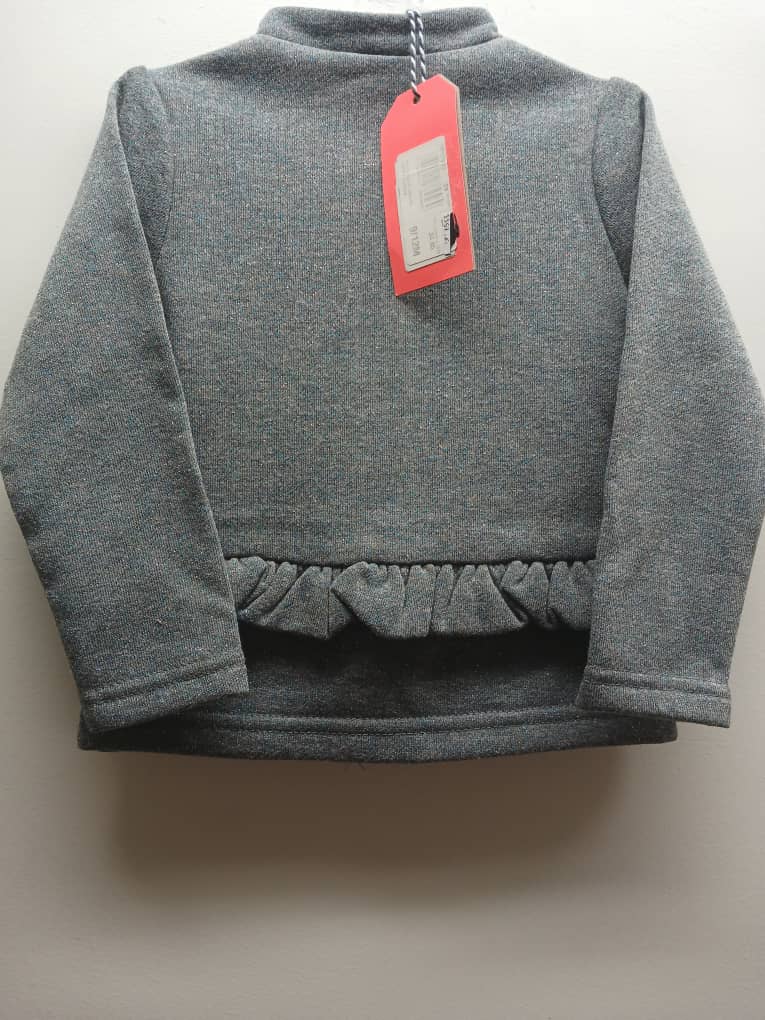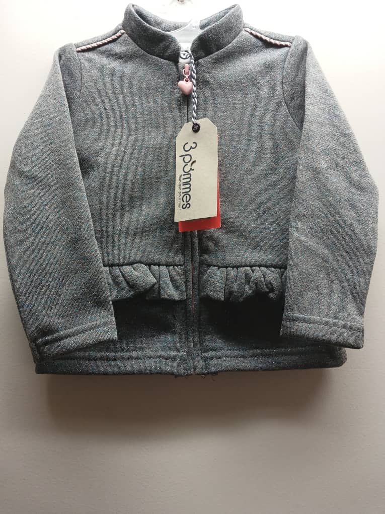 Gilet gris-signé 3 Pommes-charmant et pratique- Petit volant discret sur devant – Fermeture zippée devant- 9 / 12 mois
