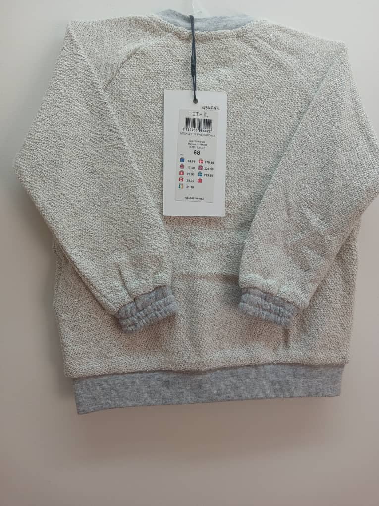 Gilet Name it pour bébé 68cm; coloris gris rehaussé d’un discret fil argenté. Finitions gris foncé à l’encolure, à la taille et aux poignets. Fermeture zippée sur le devant et poches latérales pour un style chic.