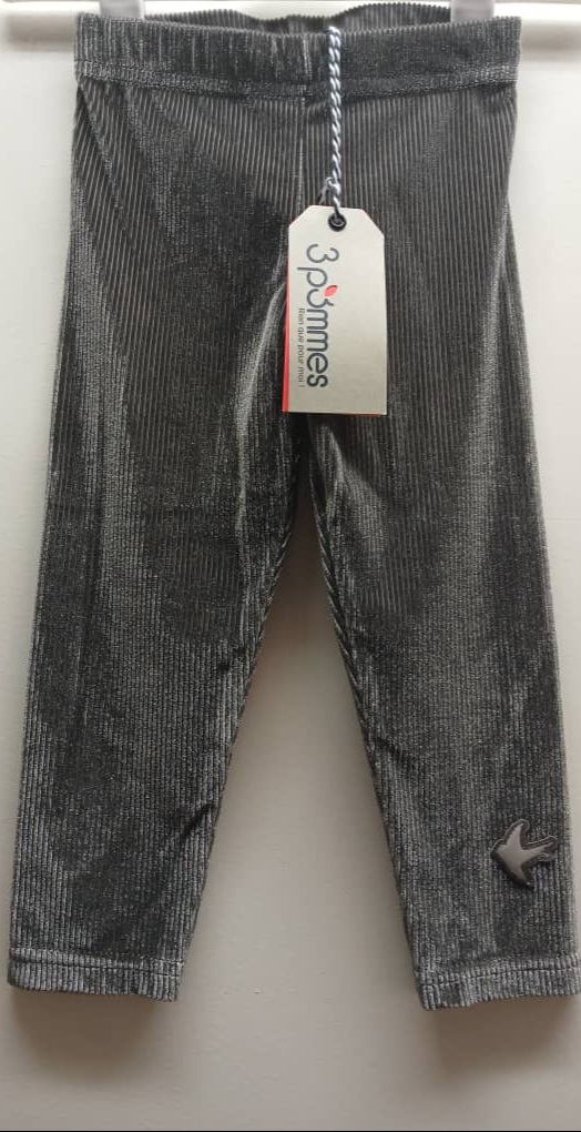 Legging 3 Pommes gris, à l’aspect brillant pour un look chic et confortable. Tissu souple et extensible, parfait pour les premiers pas. facile à enfiler- idéal pour le quotidien. Taille 9 / 12 mois