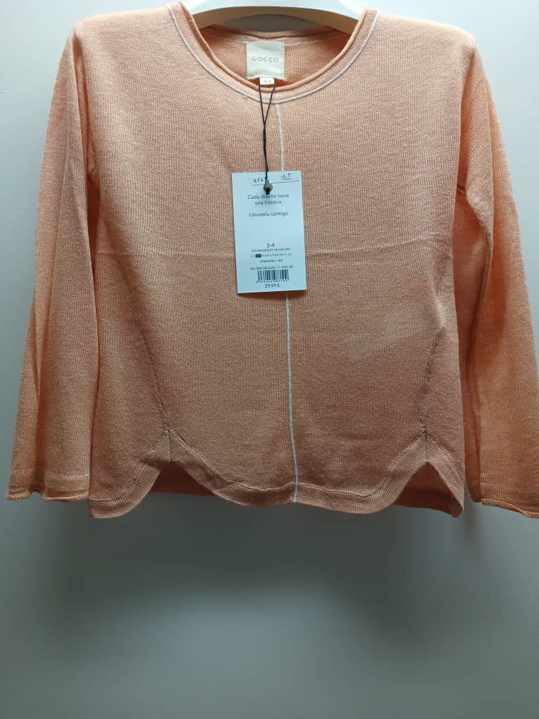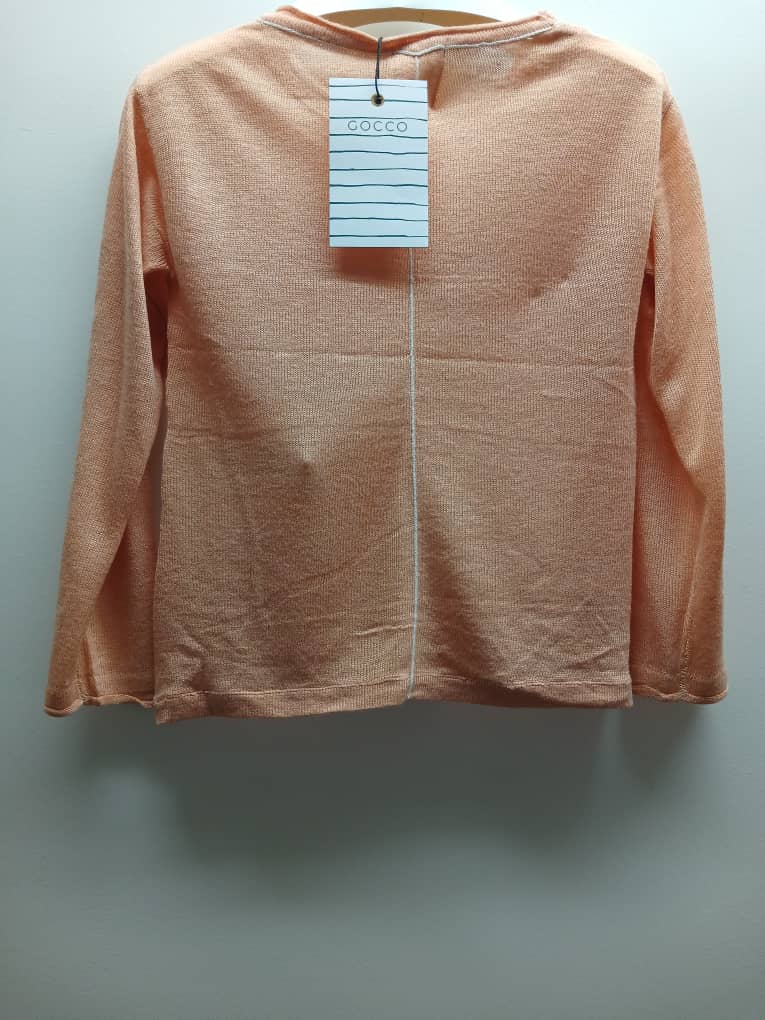 Petit pull Gocco trés raffiné en maille fine. Couleur rose pastel. Il présente une couture blanche décorative à l’encolure et le long du milieu devant. Léger et agréable à porter. Parfait pour la mi-saison.