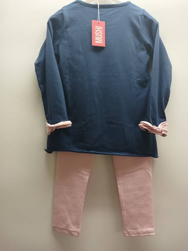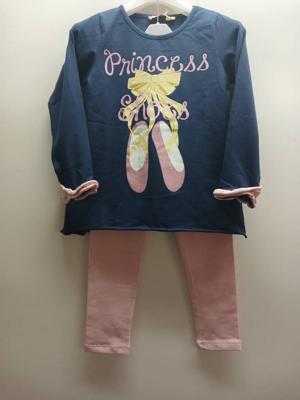 Pyjama MUSHI doux et souple composé d’un haut marine à inscription ‘Princess shoes’ rose et jaune, et d’un bas rose assorti. En 92% coton et 8% élasthanne pour un confort idéal et une bonne liberté de mouvement. Un bel ensemble de qualité durable, très agréable à porter.