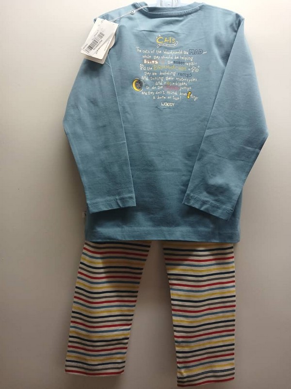 Pyjama de très belle qualité Woody, 100% coton. Bas à rayures rouges, blanches et jaunes s’accorde avec un haut uni bleu pétrole. Confortable et doux, parfait pour la nuit ou même les jours en décontracté. Confectionné dans un coton doux, respirant et agréable sur la peau. Finitions de qualité, typique de la marque Woody. Un ensemble à la fois pratique et plein de style pour les nuits d’hiver comme d’été. Fabrication belge; finitions soignées