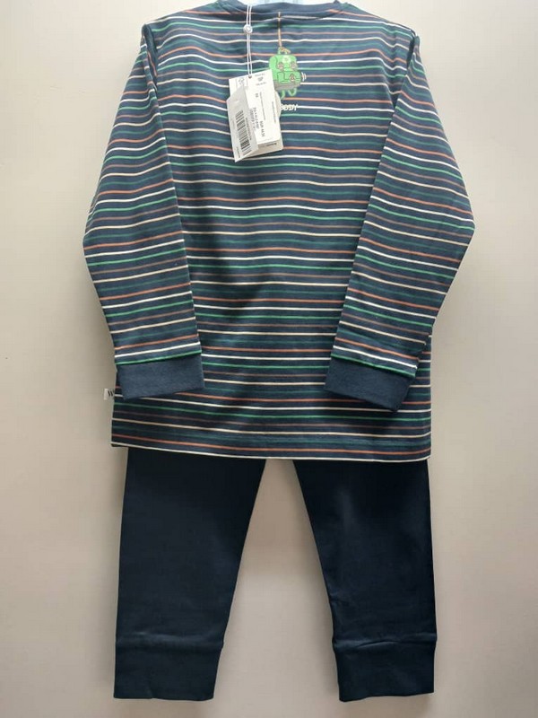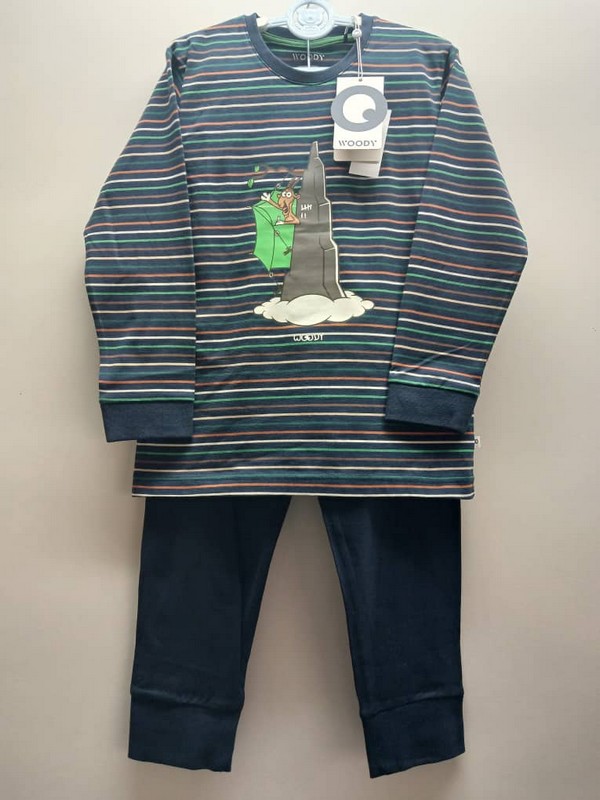 Pyjama de très belle qualité Woody, 100% coton. Haut à rayures rouges, blanches et vertes s’accorde avec un bas uni bleu marine. Confortable et doux, parfait pour la nuit ou même les jours en décontracté. Confectionné dans un coton doux, respirant et agréable sur la peau. Finitions de qualité, typique de la marque Woody. Un ensemble à la fois pratique et plein de style pour les nuits d’hiver comme d’été. Fabrication belge; finitions soignées