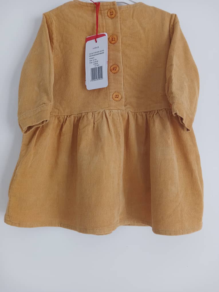 Jolie petite robe en velours de coton moutarde- douce et confortable- boutonnage dans le dos pour un habillage facile- marque Tootsa- 6 / 12 mois.