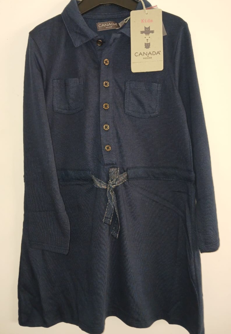 Jolie robe Canada kids au style robe chemisier. Coloris bleu marine, en coton doux respirant. Lien à la taille avec petit nœud pour une touche élégante. Confortable et facile à porter au quotidien